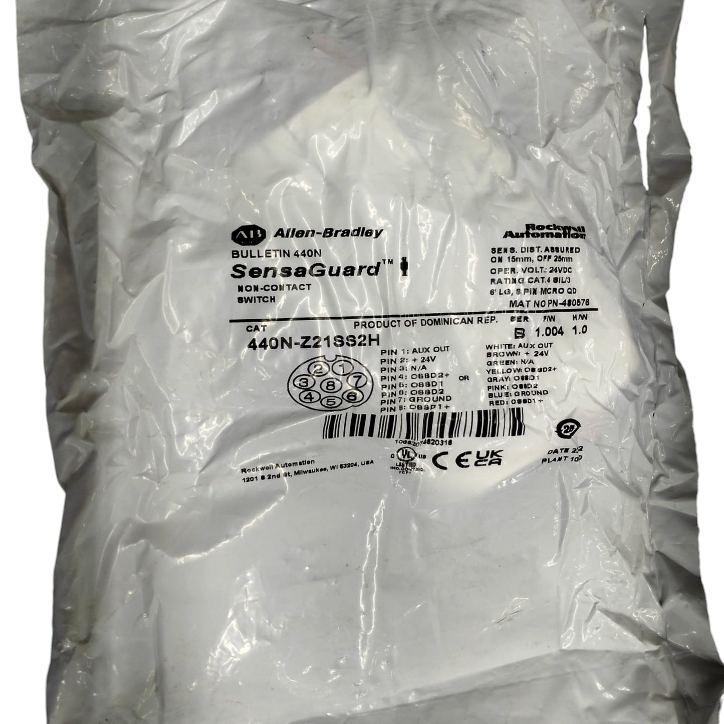 Interruptor, SensaGuard, sin contacto, seguridad, plástico rectangular, actuador, tipo de código estándar, 18 mm, distancia de detección, puerta LED, indicación/diagnóstico, conector flexible de 6 pulgadas, microconector de 8 pines, 24 V CC, 50 mA.